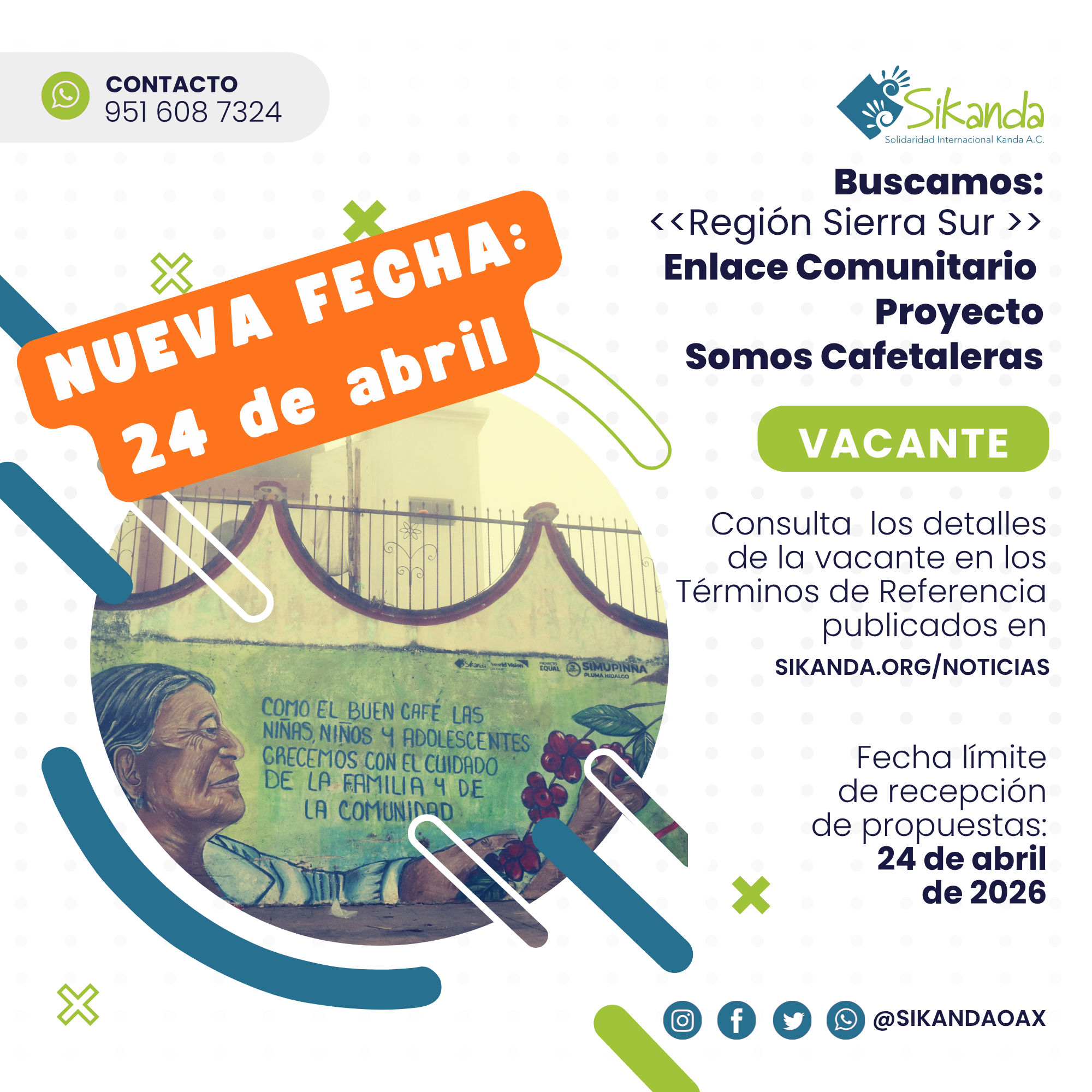 Las personas interesadas, deberán enviar un correo electrónico con el título “VACANTE ENLACE COMUNITARIO SOMOS CAFETALERAS” en el asunto a viridiana@sikanda.org y carloscamacho@sikanda.org, e incluir la siguiente documentación hasta el viernes 24 de abril de 2026: